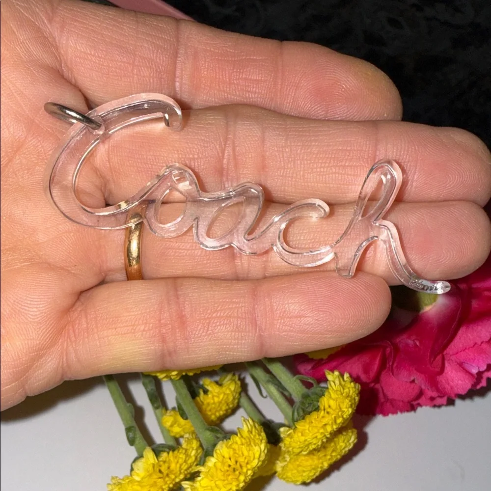 Stylish transparent keychain with Coach script. Sleek and modern design.