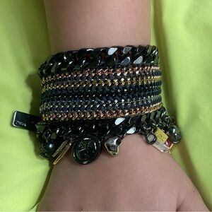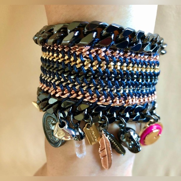 Bold Coach tribal tonal charm bracelet featuring layered blackened chains with mixed-metal charms. Statement piece with a rocker-boho edge. Excellent condition and hard to find.