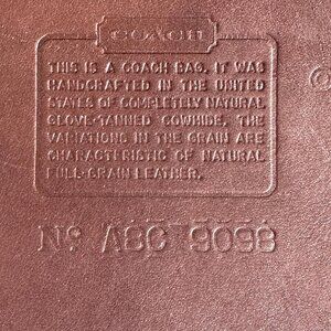 Authentic vintage Coach Tribeca Tote shoulder bag in mahogany brown leather. The creed number is A8C 9098. The creed shows that this bag is made in the United States. The zipper opens to reveal a spacious interior with one zipper pocket and one slip pocket.