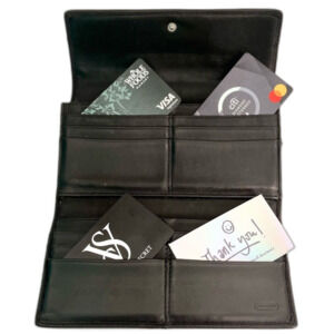 This Coach Tri-fold Ashley Pleated Wallet is a stunning piece crafted from luxurious black leather. Designed for both style and functionality, this wallet offers a wealth of features. It includes 12 card slots. Additionally, there’s a zippered pocket on the back for added storage and security. Inside, you’ll find 3 full-length pockets ideal for holding currency, receipts, or other important notes. The signature Coach stamp is elegantly placed on the lower flap, ensuring authenticity.
