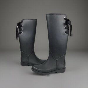 Coach Tristee Black Matte Knee High Lace Up Lined Rain Boot, Size 7, Feminine
