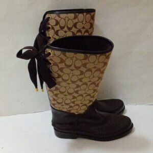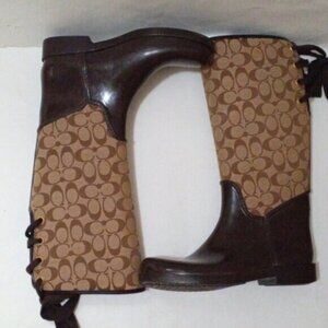 Coach Tristee Monogram Tall Faux Fur Lined Lace Up Back Brown Rain Boot Size 11B