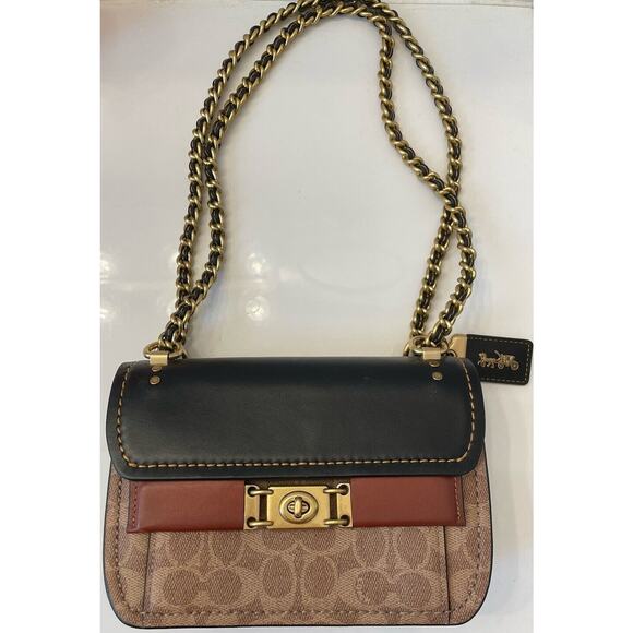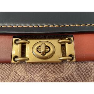 This Coach Troupe Crossbody bag features a signature canvas design with leather accents in brown. It has a rectangular shape with a turn lock closure and gold hardware. The small size includes a cross-body strap and inner pockets, with a red leather lining. The bag is adorned with a charm and strap accent, embodying a classic and designer theme, perfect for women who appreciate luxury and sophistication.