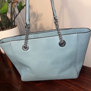 COACH New York NY 27 57107 TURNLOCK SILVER CHAIN SAGE BLUE LEATHER SHOULDER TOTE BAG