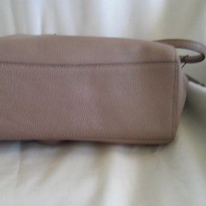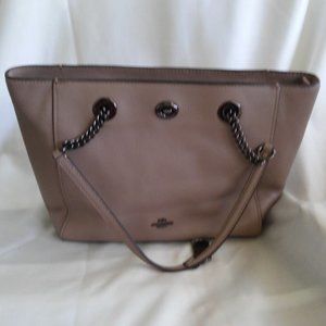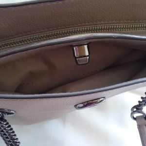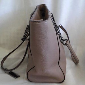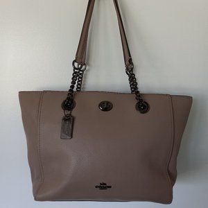 NWOT Style 57107 This Pebbled Leather Turnlock Chain Tote has Dark Nickle Hardware and Pebbled Leather in Stone. There is a zippered closure with a front Turnlock Slip Pocket for easy access. The interior has a Logo Lining, a zippered pocket and 2 open slip pockets for easy organization. The chain and leather straps have a 9.25 inch drop for shoulder wear. Perfectly sized at 10.75 x 9.25 x 5 the Dust Cover, care instructions and iconic Hang Tag are included.