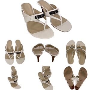 Coach Turnlock Leather Olina Matte White Thong High Heel Dress Sandals. Women’s 8.5. Matte/ Off white color and tan insoles. Thong style strap. Metal buckle, turn lock style (does not turn) across tops. Soft leather insoles. 2 3/4” heel. Markings, small tears and minor thread pulls. Most markings not seen when worn. Some wear on high heel tip. May need a little clean up. Still in good condition. See all photos.