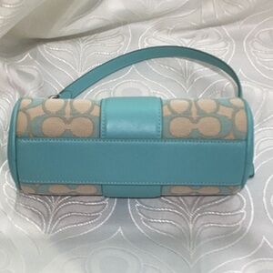 Chic Coach shoulder bag in turquoise and beige. Features signature pattern and sleek design.
