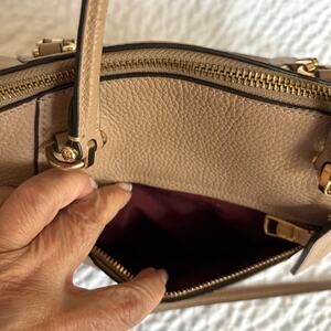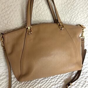 This Coach two-way tan leather finish and an adjustable strap for versatile wear. It is preloved but in good condition. Minor marks. See pictures. Clean inside.