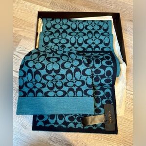 Coach. Unique knitted scarf and hat with embossed and signed coach in blue, new, never worn. In gift box. Smoke free home.
