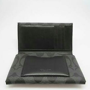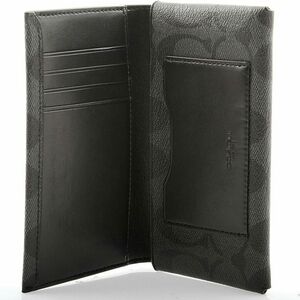 Exterior of wallet is Coach signature coated canvas in black and charcoal.