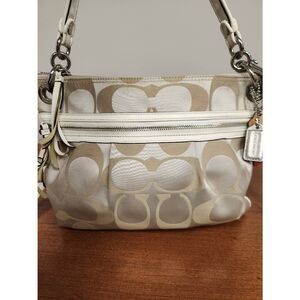 Coach VINTAGE Cloth crossbody bag with Signature Jacquard canvas Monogram. Tan with white accents. Measures approx 13 wide, 10 high