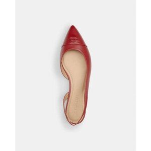 The Coach Valerie Women's Slingback Flats in red leather with a pointed toe feature an embossed Coach logo on the toe. These stylish flats are a slip-on design with a slingback strap for added comfort and a classic look. Made with high-quality leather, they have a cushioned insole and are ideal for casual occasions in the summer, fall, and spring seasons. These elegant flats are part of the Coach Signature product line, making them a fashionable and practical addition to any woman's shoe collection.