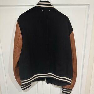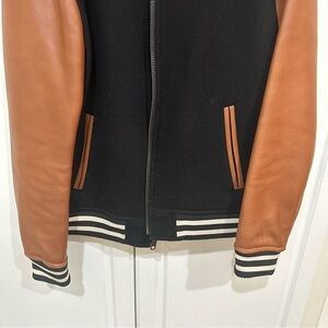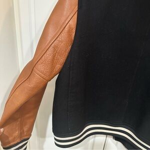 Leather and wool blend varsity jacket in saddle and black. Side pockets, roll collar,