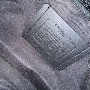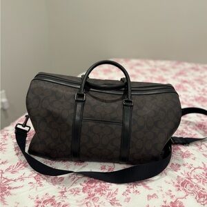 Stylish Coach duffel bag in brown canvas. Features unique travel patches. Ideal for travel and daily use.