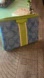 Eye-catching Coach wristlet in vibrant blue and lime. Features iconic pattern and secure zip closure.