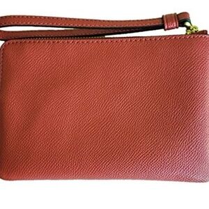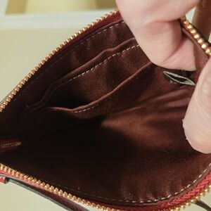 Elegant red leather pouch with strap to carry like a wristlet by Coach. Compact design with a secure zip closure. beautiful π
