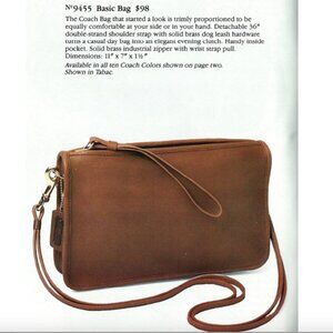 The Coach bag that started a look is trimly proportioned to be equally comfortable at your side or in your hand. Detachable 36" double strand shoulder strap with solid brass dog leash hardware turns a casual day bag into an elegant evening clutch. Handy inside pocket. Solid brass industrial zipper with wrist strap pull.