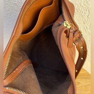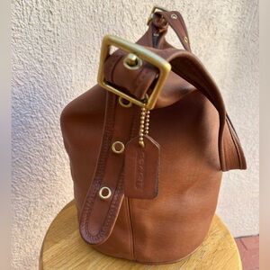 Vintage COACH large duffle sac in British Tan color. This item is vintage, roughly 30 years old, so it’s not perfect but it is in good condition and clean. There are no tears or odors and the zipper works well. There may be minor scratches and discoloration to leather.
