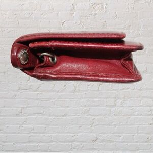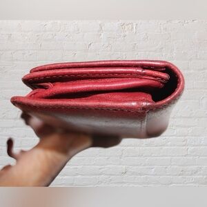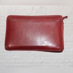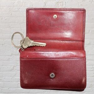 Vintage Red Coach Bedford wallet. Hidden snap closure. Outside back slip pocket. Inside slip pocket, gusset pocket, zipper compartment, and key ring. Pre-loved wallet in great condition but shoes some signs of love - see photos.