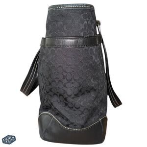 This Coach Voyager tote bag in black features the signature "C" jacquard exterior with a spacious interior lined in blue fabric. It has double leather handles and silver hardware. The bag includes inner and outer pockets, a bag charm, and a zip closure.