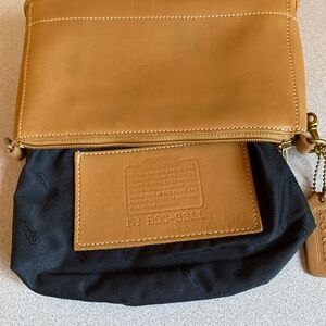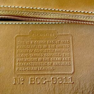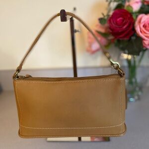 EUC Vintage 1990 Coach Bleeker 9311 Demi handbag in natural-glove tan leather. Made in the USA, characterized by its baguette shape, top handle, and a detachable leather tag. Bag is sold as is review all pictures before purchasing.