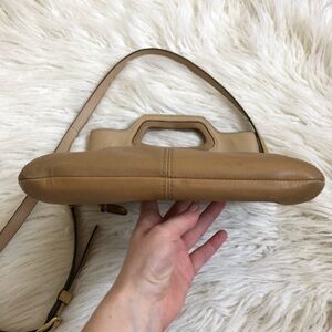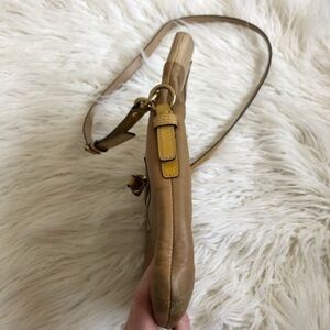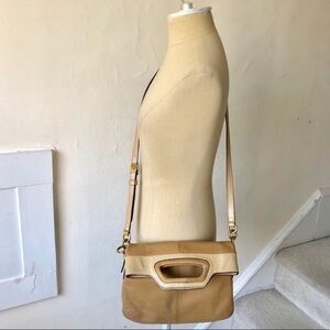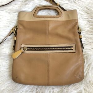 Beautiful, two tone, tan leather fold over double handle crossbody from Coach. Back zipper pocket. Magnetic snap closure. Zipper inside pocket with two pocket pockets inside. Adjustable strap. Preloved with marks and scuffs throughout so please examine all photos. Can also be worn not folded over.
