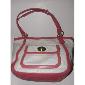 For sale is an adorable, extra large, COACH "Cricket" satchel or tote bag that is made with smooth, supple white and pink leather and gold toned hardware. It has two exterior pocket and a roomy interior with lots of pockets to keep you organized! This purse is perfect for warmer weather and originally retailed for over $325!