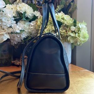 Hardly carried and in excellent vintage preowned condition overall. Supple black leather with contrast stitching and chrome hardware. Removable shoulder strap and Coach dangle included in sale! Dual top handles have an approximate 4” drop. Bag still showcases and fine leather aroma.