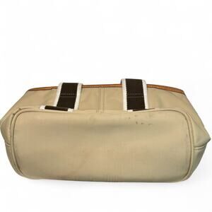 The bag has double handles with a striped webbing design and a small leather logo patch on the front with the brand name and "LEATHERWARE" text. It also includes an outside slip pocket and typically has a zip closure. measures approximately 12 inches (L) x 6 inches (H) x 4 inches (D) with a 4-inch handle drop. Still had the paper inserts in the sides Bag is NWOT but has a few light blemishes.