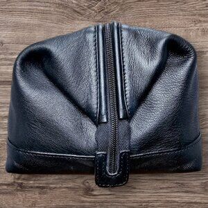 This toiletry bag is big and features a water-resistant, cleanable interior black lining. Don’t fear spills in this bag! Carry your essentials while traveling and then open it up to have a sturdy case to grab from. There is a rim lining that folds to close and opens wide. Waterproof hangtag inside of bag.