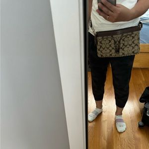 Coach vintage bag. The design of the bag was designed to be worn on the shoulder or as a waist bag. There is a slot in the back of the bag, a main compartment and two small compartments in the front of the bag. Bag is used but in good condition. The interior is pretty clean. There is a tiny mark in the interior of the main compartment (see picture #7). There’s also a stitching thing on the left front pocket (see picture #11). There’s a tiny chip(?) on the back of the bag where the brown leather is (see picture #4).