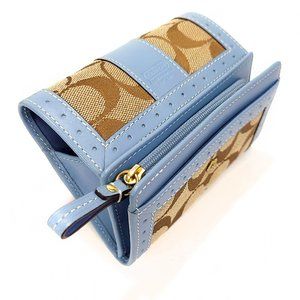 This Coach wallet was found in my parents’ house packed away in a closet, it’s about 30 years old and was never used but was carefully stored. It is a 5”x3.25” tan canvas body with logos and light blue leather accents and satin liner with Coach logo in the interior. It is in perfect condition, no scratches, no stains, no fading, like brand new.