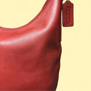 The Coach Red Hobo Bag features a sleek crescent silhouette crafted from luxurious, smooth leather. Its minimalist design and single shoulder strap offer both style and practicality, making it an ideal choice for everyday use.