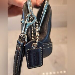 Black leather wristlet with kisslock. 6.5 x 4.5. Circa:2004. Has original hangtag and wrist strap.