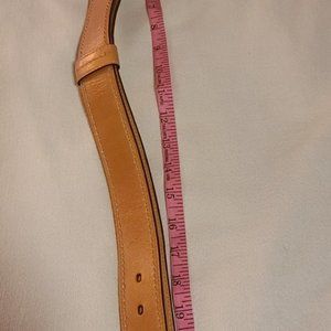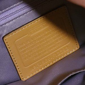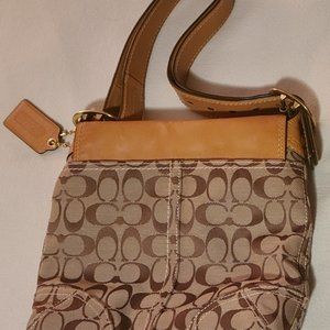 This is a gently used Coach purse that I bought back in 2009/2010. I bought it at full price and was just so eager to have my first Coach purse! However, this has never been my style at Coach. It features their classic logo printed fabric and tan leather. It is lined in purple fabric. It has a magnetic closure. Beneath the closure, there is a small pocket. On the inside, their is a medium and a small open pocket. There is also a larger zip pocket and of course the larger open area. It also has the leather plaque with its serial number, proving that it is a legit Coach item. The strap has holes on both ends which is unique - you can make it super long or short, like I have it in the photos. The bag is 11 inches across. It is 10 inches long. The strap, when folded in half, is about 26 inches long. It does come with the brown fabric bag to store it in, which I have done since I bought it. I cannot find the original tags but I can include care instructions!