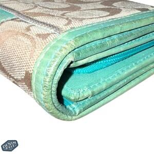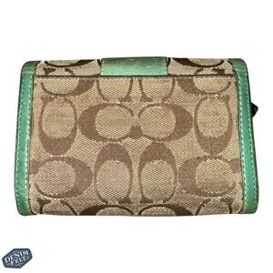 Coach wallet, trifold wallet, Coach signature canvas, green leather wallet, small wallet, compact wallet, Coach accessories, Coach coin purse, women’s wallet, Coach snap wallet, logo wallet, Coach card holder, designer wallet, Coach green trim wallet, Coach with horse and carriage