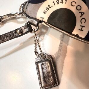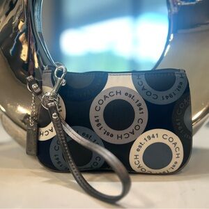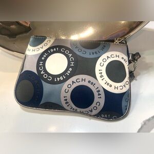 Stylish Coach wristlet in a chic blue and gray design. Perfect for carrying essentials with elegance.