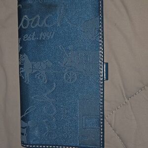 Stylish blue Coach check book cover with iconic horse and carriage motif. Ideal for a chic accessory upgrade. Missing pen and has stain on back.