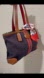 Stylish Coach tote in denim with brown leather trim. Features bold red stripes and a floral bow. Perfect for everyday use. Small tote. Has hangtag. Comes with the bag scarf shown. EUC!! Has one mark on the corner leather as shown. Brown straps that are red underneath. 2004