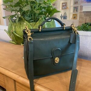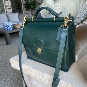 Coach Vintage Willis Satchel in Bottle Green leather 9927, made in 1994 in the USA. Includes original hang tag, long adjustable detachable strap, New green print Twilly, , brass hardware with lobster clasps, turn lock closure, raw leather interior, outer front and back pockets, inside zipper pocket, top handle. Condition is EXCELLENT inside and outside! Very clean no odors, harder to find color, leather is supple and buttery, shape and structure are excellent. Will come well Packaged.