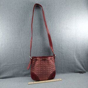 This Coach crossbody bag, with its signature jacquard design, offers both style and functionality. The deep red leather accents add a touch of elegance, while the adjustable strap ensures comfort. Ideal for carrying essentials in a sophisticated manner.
