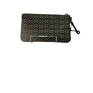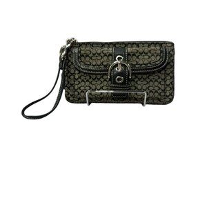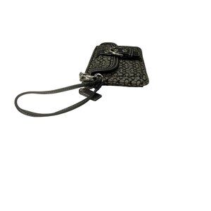 The Coach Vintage Y2K Micro Bag in Signature C is a classic mini bag/wristlet with a stylish gray and black exterior featuring the iconic logo pattern. It has a zip and snap closure, black leather strap, and silver hardware accents. The bag comes with a detachable strap and a bag charm, making it a versatile accessory for women looking to add a touch of designer flair to their outfit. Made from a combination of jacquard, canvas, and leather, this Coach Legacy product offers both luxury and functionality in a compact design.