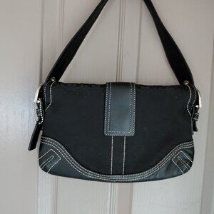 Coach Vintage Y2K Soho Mini Shoulder Bag. Pre-Owned, Excellent Condition. This Bag was manufactured in Coach Facility May, 2002. The Manufacture #G052-3628, is Rare Vintage. Signature C with leather trim, contrast stitching, leather adjustable strap. Bag is clean, with no tears or stains, with minimal signs of gentle wear. The inside has one zip pocket, a center divide, and one slip pocket. The Coach tag is attached, and the Coach Creed inside. The Silver Tone Hardware is in excellent condition, with no to minimal scratches. This bag has a snap closure. Measurements: 10x7x1.