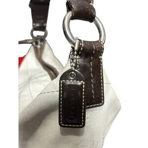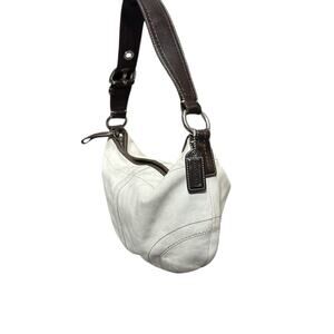 This authentic vintage Coach hobo bag, believed to be the Soho style, features a slouchy, crescent silhouette popular in the Y2K era. Crafted from soft white leather with contrasting dark brown leather trim and an adjustable shoulder strap. It includes the original Coach hangtag and a zippered top closure. A chic, timeless piece perfect for adding a touch of vintage flair to your outfit!