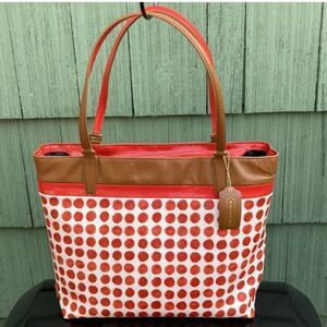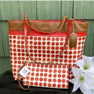 This is a beautiful vintage retro coach set. The tote has the original packaging on the zipper inside with original care instructions, it doesn’t appear to have had anything inside of it before, the top edge by the zipper looks a little warn, but unsure if that’s from storage or not, there is a little bit of red smudging from the red dots on the bottom and up the front, but hardly noticeable. Other than that this is in amazing shape.