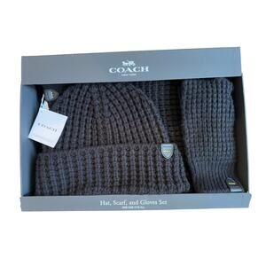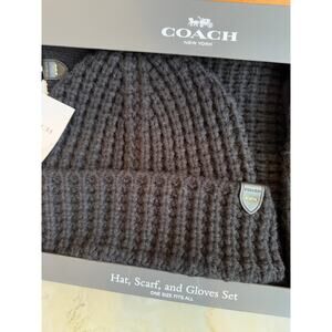 New Coach Waffle Beanie Hat and Scarf and Glove Set Black. Acrylic & wool blend with genuine leather trim.