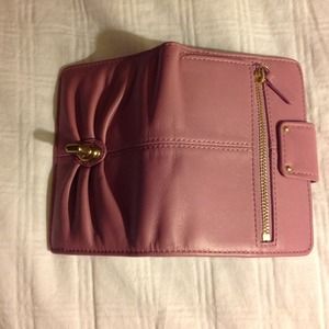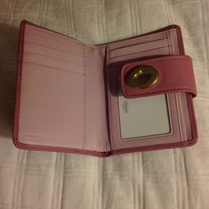 Lavender Coach wallet with gold hardware and light lavender interior. Small wallet with change zipper, cash pocket, 6 credit card pockets, clear ID holder, and 3 additional interior pockets. Approximately 6"x3" closed.