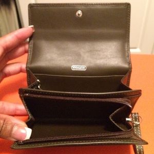 Dark brown suede/leather trim with six pockets, which includes a coin pocket with zipper and a key chain inside. In pristine condition. Comes with small dust bag.
