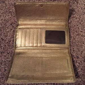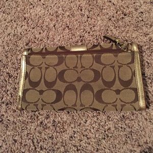 Authentic coach wallet. Logo print, brown and tan canvas, gold leather trim & inner. Credit card and clear ID slot. Several money slots