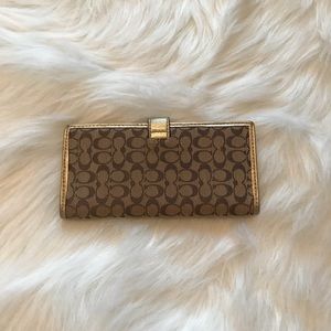 Gold and khaki color. Great used condition! No scratches or marks! Thin wallet with a snap clasp.